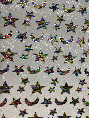 White/Silver Moon & Stars Reversible Geometric Stretch Sequins On 2 Way Stretch Mesh Sequins Fabric By Yard