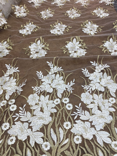 White/Gold Floral Mesh Lace Fabric With Double Border By Yard